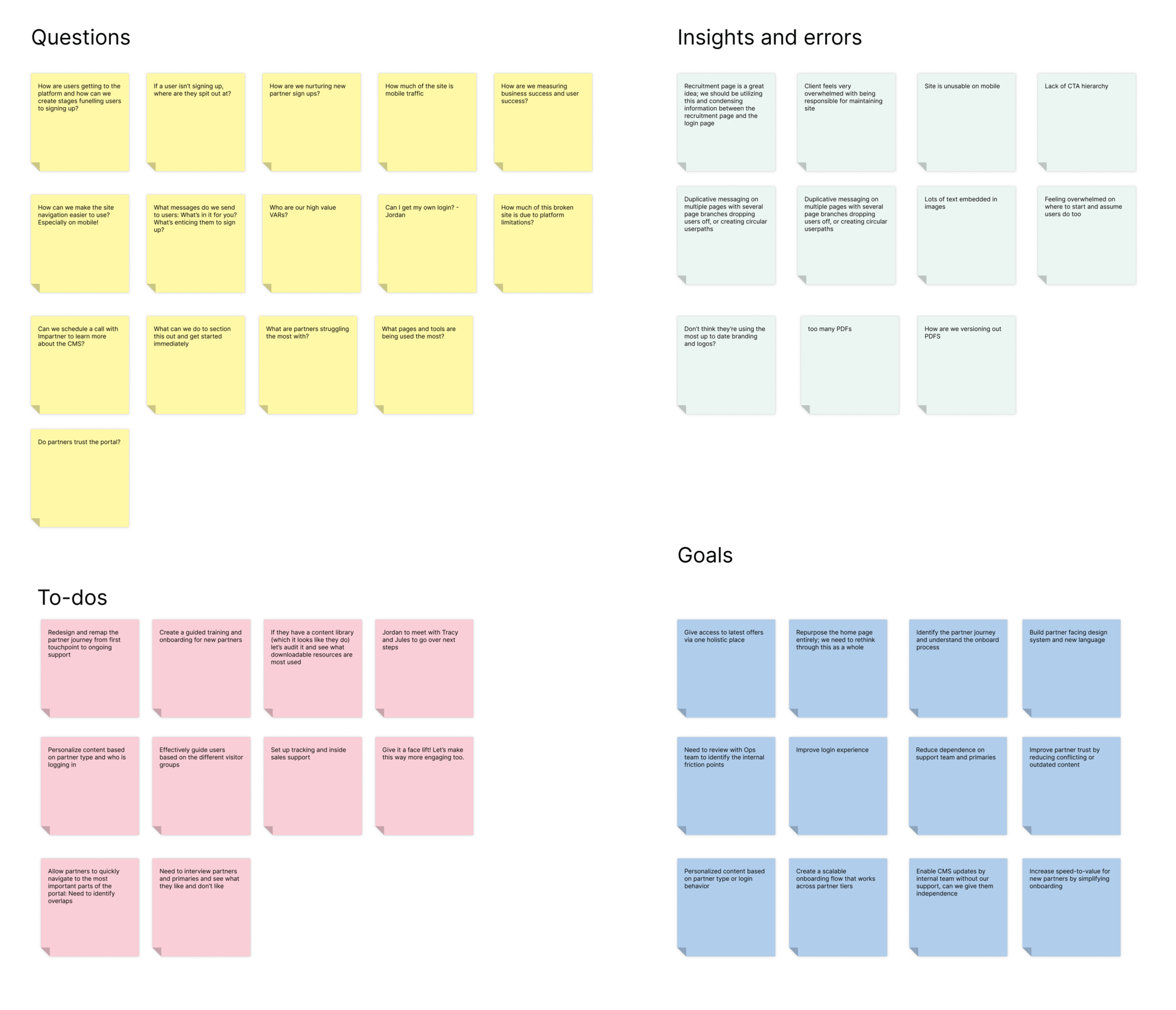 The sheer volume of pages was overwhelming and we were jumping in headfirst. Through group syncs and whiteboarding, we started to orient ourselves: What did we need to know? Where were the biggest pain points? And most importantly, what kind of experience did we want this portal to deliver?